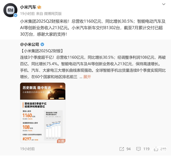 小米汽车的财报继续延续了过往的惊艳表现。2025年1-6月,小米智能电动汽车及AI等创新业务分部总收入达398.43亿元,同比大涨200%,占小米集团总营收的17.5%,其中智能电动汽车收入为387亿元。此外,智能电动汽车及AI等创新业务分部毛利率约达24.8%。