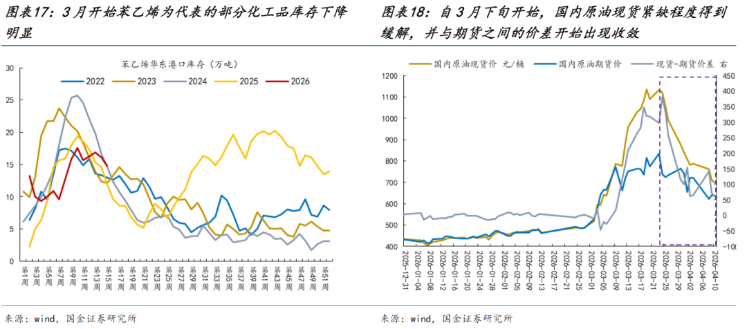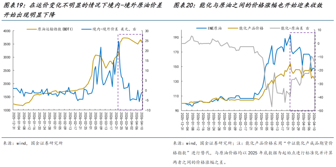 与此同时,几组相对的价差变化值得关注:首先是原油的国内—国外在运费变化不明显的情况下,出现了明显下降;其次是原油的现货—期货的溢价出现了明显的下降;第三,原油和能化的价格出现了下降。整体来看,一个图景正在清晰:中国战略库存或已释放,同时在远月做多回购库存,这一方面让国内成本紧张程度下降,同时也让国内企业具有相对海外更稳定的成本优势,国内企业利润空间有望修复从而带动价格往下游传导。