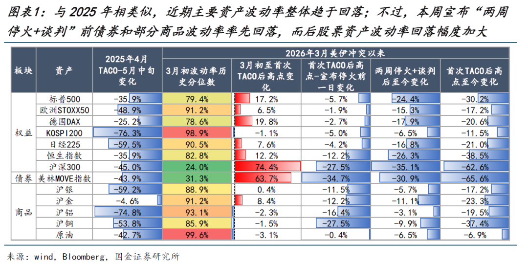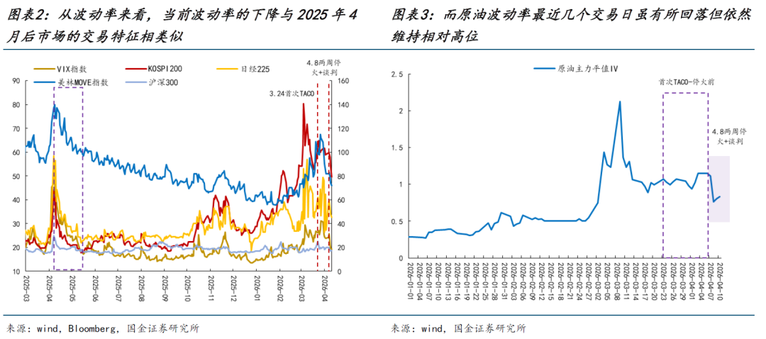 本周最大的变化在于美伊进入为期两周的停火窗口期,地缘风险显著下降,原油价格下跌,而风险资产迎来共振修复。这与2025年4月特朗普“对等关税TACO”后呈现出相类似的交易特征: