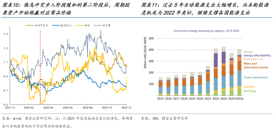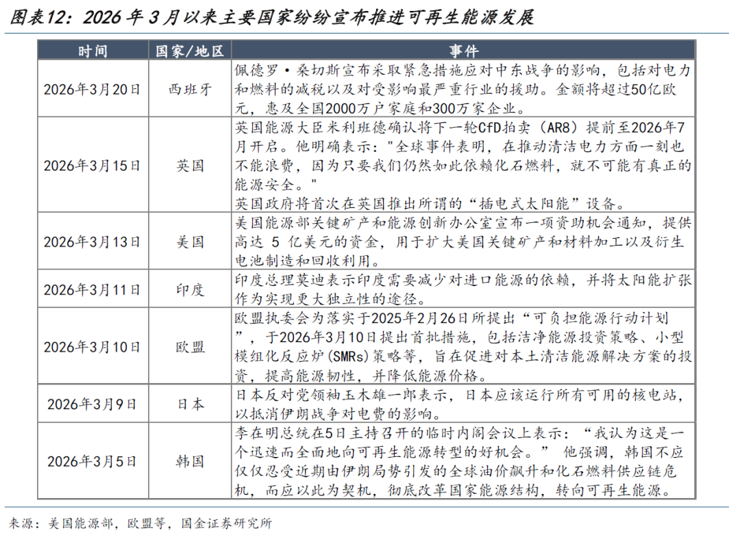 而随着局势逐步趋于稳定,未来基本面的演绎路径也将日益清晰,能源主线将会慢慢浮现,并带动新旧能源形成共振。一是能源类股票资产或将逐步跑赢商品。海峡的开放缓解了市场对于此前基本面不确定性的担忧,市场波动率正在回落,而能源价格中枢上移的确认使得投资者开始对股票资产的长期产能价值进行计价。参考2022年经验来看,在俄乌冲突的第二阶段(双方边打边谈,突发战事带来的供应链紊乱得到阶段性缓释),欧洲步入能源补库阶段,能源相关股票资产开始逐步跑赢商品。二是在“能源安全”诉求强化的背景下,各国资本开支方向或进一步向新能源倾斜,新一轮新能源建设周期值得关注。事实上,过去5年全球能源支出大幅增长,尤其是2022年俄乌冲突后全球进一步提升了对能源安全的重视程度,相关支出显著增加。而本轮能源危机或与2022年类似,当前部分欧洲和亚洲国家已提及加速可再生能源发展,而我国有望凭借在新能源领域的竞争优势,在未来海外新能源需求加速释放的过程中实现充分受益。