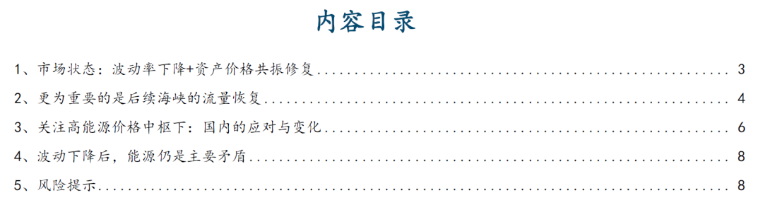 尽管市场对油价的波动性呈现不敏感,但能源仍然是核心的矛盾。我们在上周周报《市场当前并非稳态》中提出未来可能出现两种场景:目前来看,随着美伊双方进入两周的停火窗口期并开启谈判,尽管双方仍存在分歧点,但第一种场景出现的概率正在上升。当下的情形更类似于“海峡迎来了开放的消息,但是尚未完全放开”:尽管金融市场已做出了快速反应,但考虑到产能的恢复本身存在客观时间约束,供给释放难以一蹴而就;另一方面,常态化后可能是各国防御性主动补库的开始。因此,能源价格中枢大概率出现上移,能源问题依然是当下的主要矛盾。而随着局势逐步趋于稳定,未来基本面的演绎路径也将日益清晰,能源主线将会慢慢浮现,并带动新旧能源形成共振。一是能源类股票资产或将逐步跑赢商品。海峡的开放缓解了市场对于此前基本面不确定性的担忧,市场波动率正在回落,而能源价格中枢上移的确认使得投资者开始对股票资产的长期产能价值进行计价。二是在“能源安全”诉求强化的背景下,各国资本开支方向或进一步向新能源倾斜,新一轮新能源建设周期值得关注。本轮能源危机或与2022年类似,当前部分欧洲和亚洲国家已提及加速可再生能源发展,而我国有望凭借在新能源领域的竞争优势,在未来海外新能源需求加速释放的过程中实现充分受益。