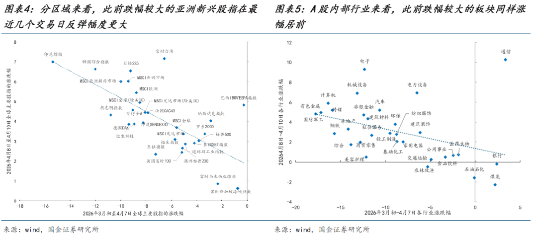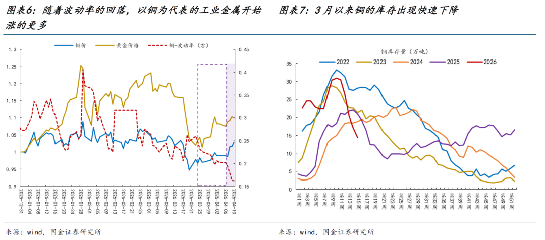 本周最大的变化在于美伊进入为期两周的停火窗口期,地缘风险显著下降,风险资产迎来共振修复。这与2025年4月特朗普TACO后呈现出相类似的交易特征:(1)市场整体呈现 “波动下降+资产价格修复”的演绎特征。尽管3月下旬特朗普已出现首次TACO,多数资产波动率开始自高位逐步见顶,但基于对未来战争的谨慎观望,债券与部分商品波动率率先回落,而原油和股票资产则维持高位震荡。直至4月8日美伊两周的停火周期带来了海峡开放的消息,市场才迎来明显的修复信号,股票资产波动率下行斜率明显加快。虽然原油波动率的下降相对缓慢,但跨资产的联动性在下降,市场开始阶段性对原油出现脱敏。当然,未来战争也可能还有变数,这并不代表着市场定价马上会迅速回归到战争前的乐观预期。(2)市场修复过程呈现出较为典型的“超跌反弹”特征。分区域来看,此前受损更大的区域如韩国为代表的新兴股指,在本轮修复中反弹幅度优于美股;A股内部亦呈现出相似的规律,前期跌幅居前的电子、机械设备、电力设备等行业在最近几个交易日中反弹幅度同样靠前。参考2025年4月经验来看,即便后续双方可能处于谈判的拉锯战中,但市场资金选择复刻去年的记忆抄底此前估值受损更大的板块。有色金属方面,随着铜的波动率持续下降,市场开始转向关注基本面。而3月以来铜的社会库存已持续去化,这意味着中期维度下,未来供需基本面的结构变化将逐步成为更值得重点关注的方向。
