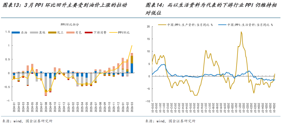 本周国内通胀数据公布,3月PPI同比上涨0.5%,结束此前连续41个月的负增长区间,实现由负转正。从结构上看,本轮PPI回升更多受到石油产业链相关品种的拉动,包括石油和天然气开采业、石油煤炭加工业以及相关化工品价格的上涨,成为推升PPI的核心力量。与此同时,全球有色价格维持高位运行,尽管3月对PPI的边际拉动有所回落,但仍构成PPI回暖的重要支撑因素之一。根据测算,上述能源、化工和金属链对3月PPI环比涨幅的合计贡献在70%以上。事实上,生产资料与生活资料价格增速差持续收窄,也表明当前PPI回升更多体现为上游成本推动的“输入性通胀”。