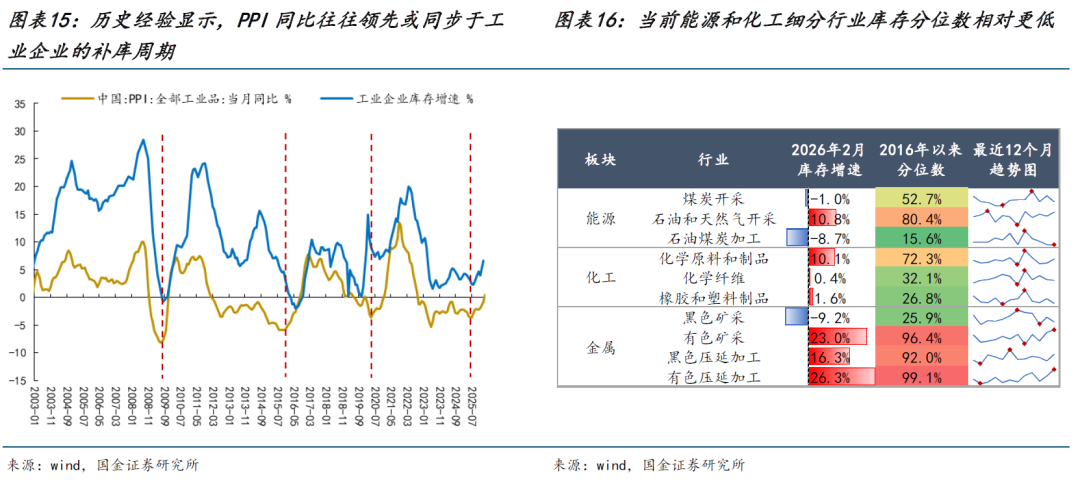 更为重要的是,相较于价格层面的“被动修复”,在高能源价格中枢的背景下,随着生产“常态化”后,未来企业可能开启的补库周期值得关注。从宏观的视角来看,历史经验显示PPI的回升通常领先或同步于企业的补库周期,而本轮PPI已于去年7月见底,工业企业库存增速也从去年9月开始逐步回升。产业链条来看,主要是能源、化工相关细分行业当前库存分位数水平相对更低。当下,在第一种场景出现概率更高的情形下,海峡流量迎来修复但可能较为缓慢,基本面不确定性有所下降,而未来原油库存消耗可能带来潜在供给缺口的逐步显现,海外订单有望继续转移至国内,尤其是在部分高能源依赖度经济体已出现阶段性停工(如3月下旬韩国LG化学宣布关停部分装置等)。